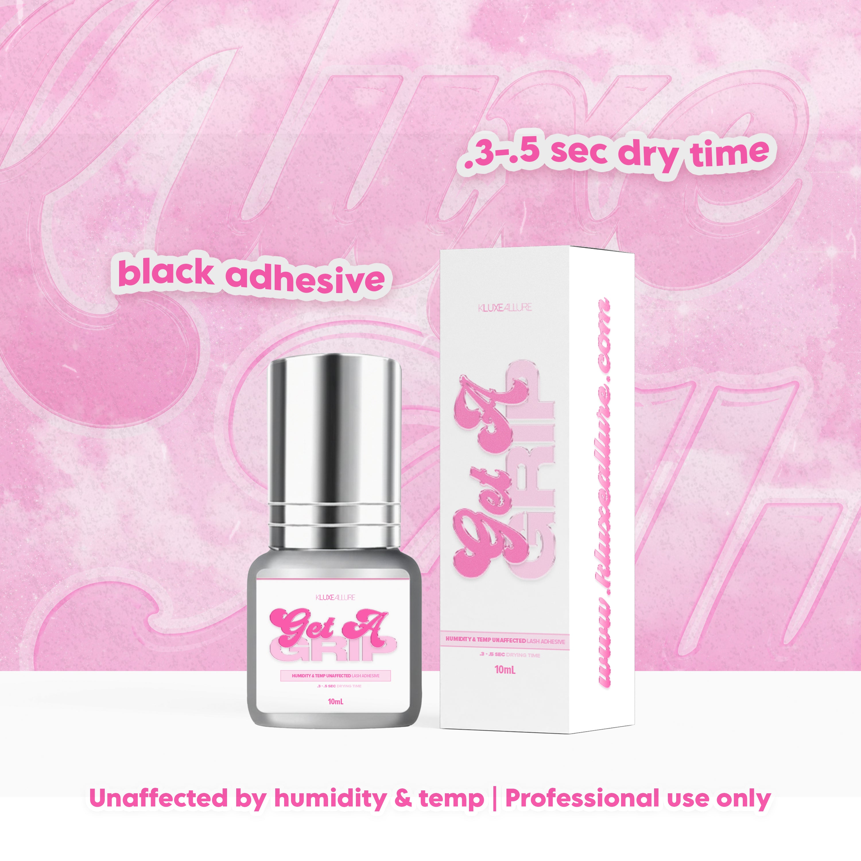 Our “Get a grip” Lash adhesive is a .3 -.5 second black bond adhesive. This adhesive is great for beginners & experienced lash artist. Get a grip Adhesive adheres and cures very quickly onto the natural lashes. This glue contains little to no fumes, great for sensitive eyes. Also is UNAFFECTED by temp & humidity.