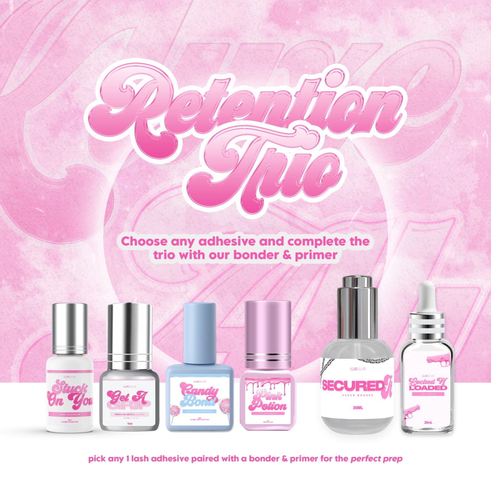 Trio includes ONE adhesive of your choice + ONE Secured It Super Bonder + ONE Locked N’ Loaded Lash Primer.